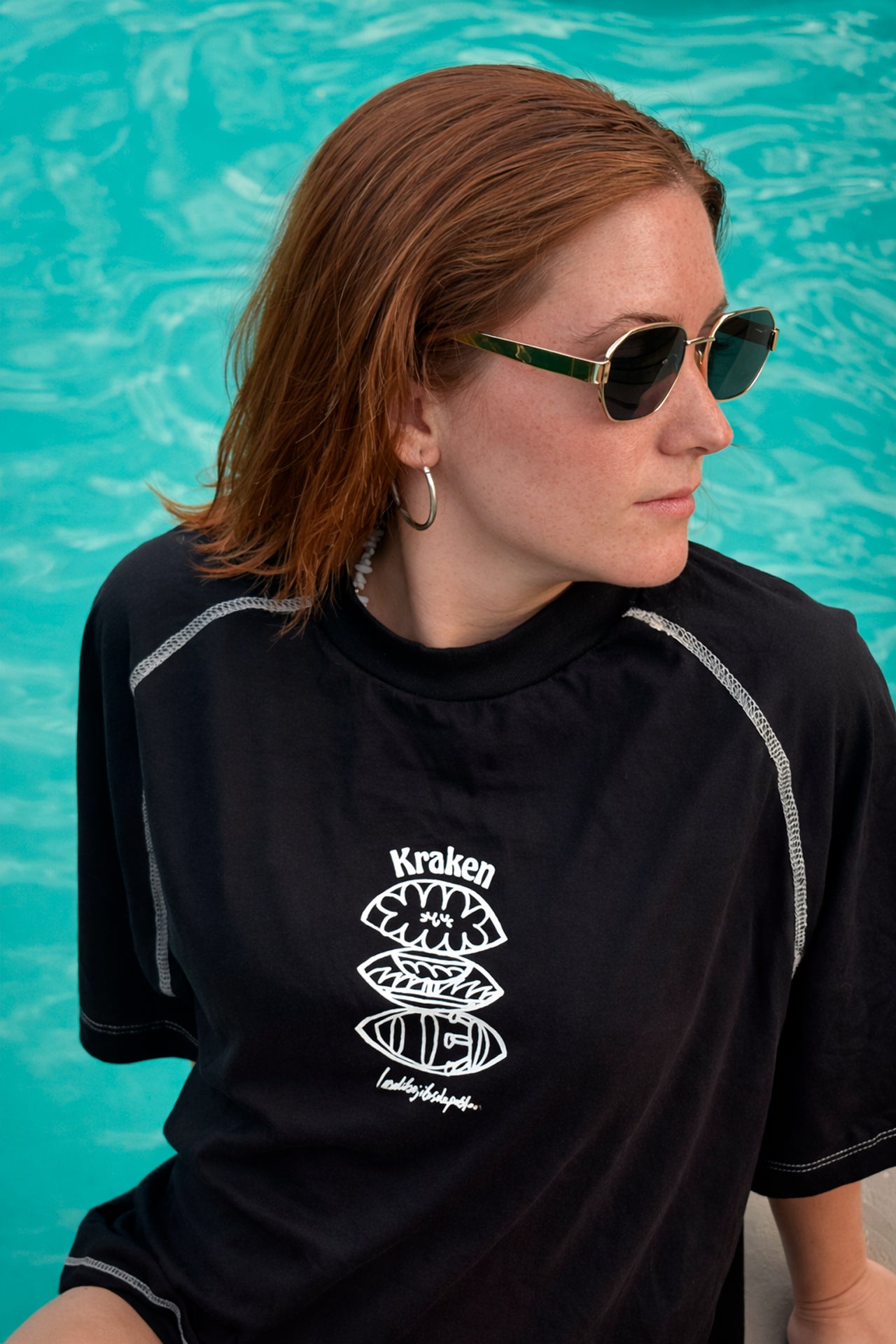 Los diseños parten de símbolos uruguayos, surferos y playeros, simplificados hasta su esencia. Su corte ranglan con costuras a la vista remite a los trajes de surf, sumando identidad y movimiento sin perder comodidad.